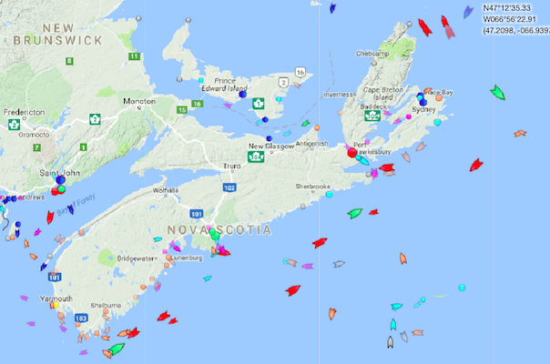 周三上午9点15分,新斯科舍省附近海域。似乎有更多的油轮(红色船只)交通比往常;我不知道这是否与飓风导致德克萨斯州石油生产中断有关。地图:marinetraffic.com