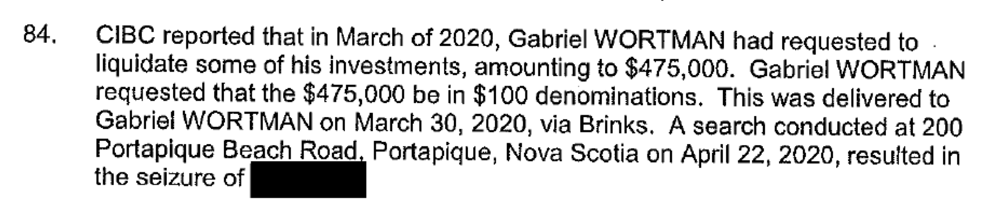 五天后,也就是3月25日,GW“赎回了一些投资,获得了7.5万美元。”他还把钱存入了公司账户。同一天,他与加拿大帝国商业银行波特兰街分行的分行经理通话,要求给他47.5万美元的现金,都是百元大钞。“安排好了”通过布林克公司提供现金,这是五天后完成的。