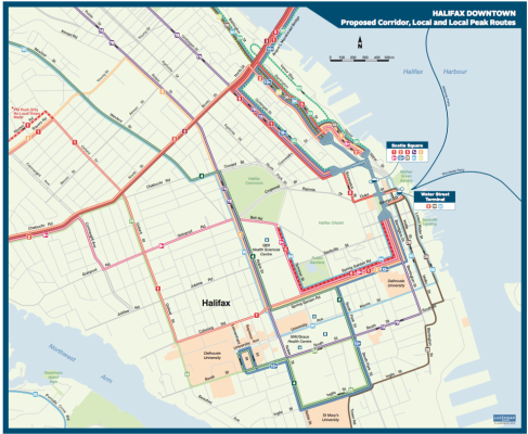作为共同前进交通计划的一部分,哈利法克斯市中心的地方和地方高峰路线的走廊建议。