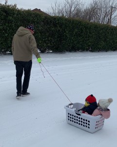 本周,在德克萨斯州的普莱诺,一名男子和孩子们用一个临时雪橇。照片:丹尼尔Megison / Twitter
