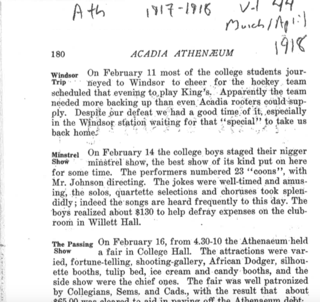 1918年,在阿卡迪亚艺术学院的3 / 4月刊上,我们看到了一篇关于阿卡迪亚大学的“黑鬼吟游表演”的报道,内容是“23个黑人”。这次活动显然是“一段时间以来在这里举办的同类活动中最好的一次”。当然,它是最好的,表明它不是唯一的,而且这些节目是经常发生的。