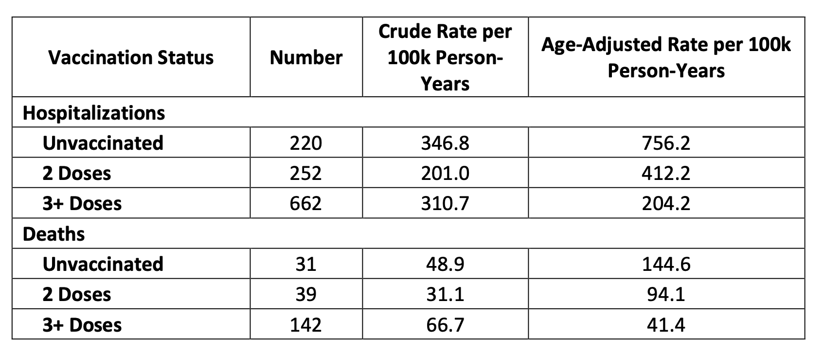 “人年”是指一段时间内的人数。如果你一年研究100个人,有100人年,如果你研究10个人,有10年,也有100人年。在这种情况下,研究人员在4个月的时间里(3月31日至7月31日)对这些人进行了研究,“粗略比率”是每10万人中每一种疫苗接种状态下住院或死亡的人数。