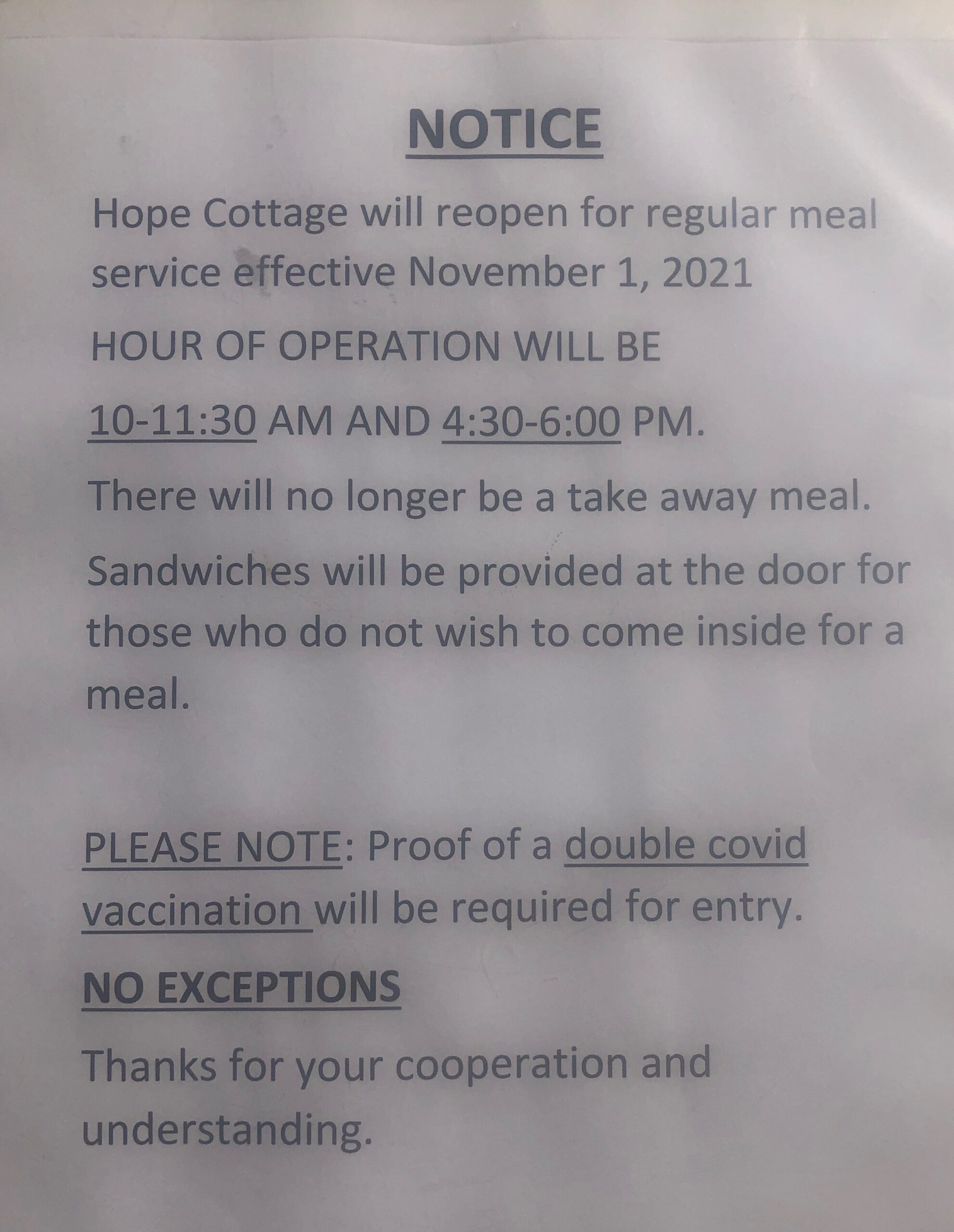 在过去一年半的时间里,“希望小屋”的工作人员和志愿者每天从前门向排队在人行道上的人们分发三明治或饭菜。大约10天前,店门上贴出告示,通知顾客11月1日(今天)将重新开放,每天提供两顿热饭。