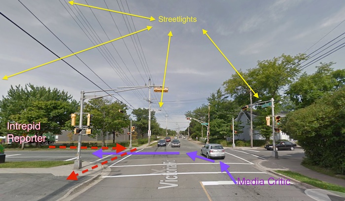 更令人困惑的是人行横道的糟糕位置——它不是在商店里,在那里它对所有的行人都有用,而是在向南半个街区,在那里它只对南行的行人有用。我怀疑(不知道)这位81岁的老人当时是往北走,而不是往南走,因此他在应该合理的人行横道的地方过马路,以避免在雨中多走一个街区。毕竟,他已经81岁了;一个街区是一段很长的路。