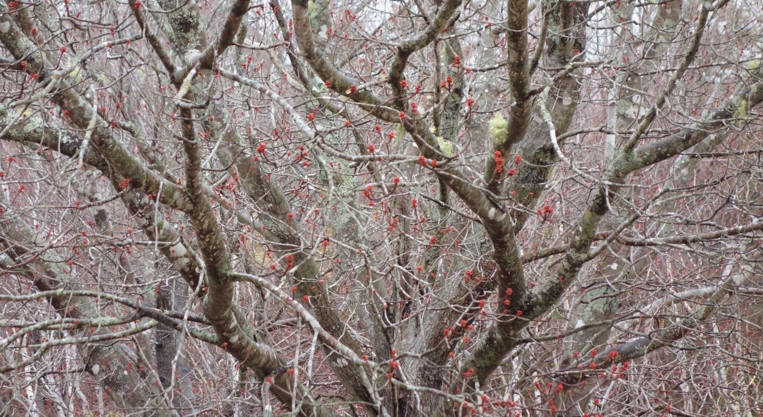 希拉喜欢指出,我们的大部分花园曾经是红枫沼泽。那个时间的残余是我们从厨房窗口看到的大红枫。在这一刻,它被放在了相当的节目中,因为红色(芽)的点出现在灰色枝的阴霾中。潮湿的天气丰满着树木在树上的地衣,额外的颜色。