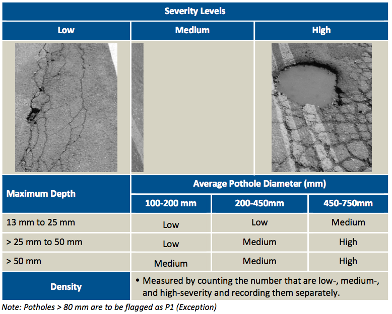 该指南(在这里找到)解释说,主干道及主要和次要街道将每两年进行一次调查。显然,这背后有完整的科学依据;《指南》对各种路面崩解有很多定义,包括“鳄鱼裂缝”、边缘裂缝、纵向裂缝、横向裂缝、出血、坑洞、修补和实用切割修补,然后是“粗糙度和车辙深度”的一节。下面是关于坑洞的部分: