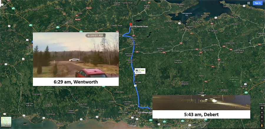 皇家骑警的地图显示GW的路线从Debert的123 Ventura Drive到温特沃斯的2328 Hunter Road。从不同视频中截取的静态图片显示,乔治华盛顿大学的仿制警车早上5点43分在德伯特市驶过,早上6点29分在温特沃斯的亨特路驶过。