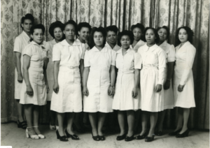 维奥拉·德斯蒙德(左二),与1947年德斯蒙德美容文化学院的毕业生在一起。图片:比顿研究所/加拿大百科全书