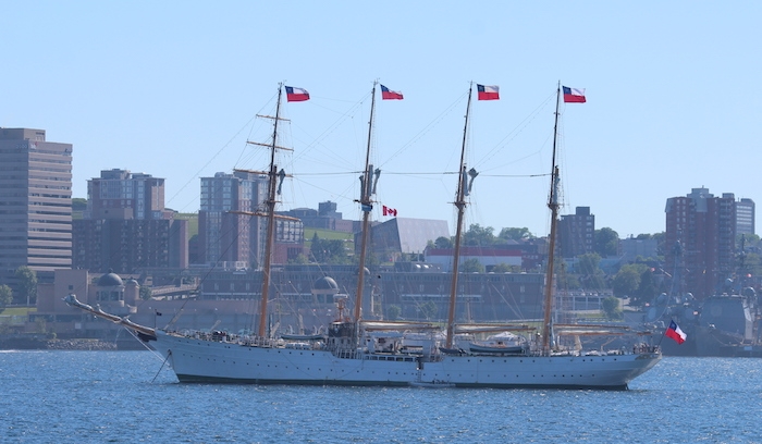 下午5:30:Esmeralda.,智利海军的一艘帆船,从安克雷奇移动;拉埃斯梅拉作为酷刑监狱由皮诺切特政府。