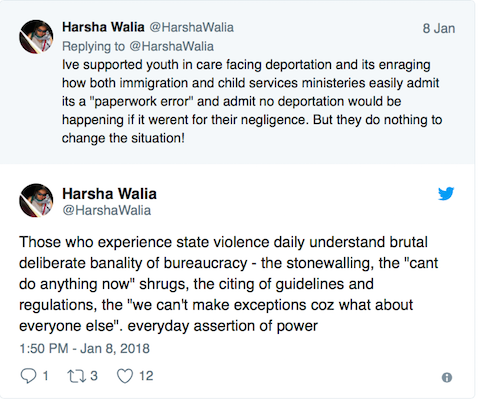 当我们坐在等待Trudeau到达时,Emma Halpern发短信给我。黛布拉斯宾塞的加拿大公民身份的申请成功。她不会被驱逐出境。停止被驱逐出境需要数年。艾玛说她感到含糊的情感,黛布拉这样的喜悦,但恐惧和担心Abdoul。她希望黛布拉的案例可以帮助船只,她鼓励我们,说阿卜杜尔的案件的压力有助于德布拉。我第一次和阿卜杜尔交谈时,他问我为什么要帮助人们。“你曾经认为你可以赢吗?”他说,我告诉他“是的,我们可以赢得,至少胜利。”