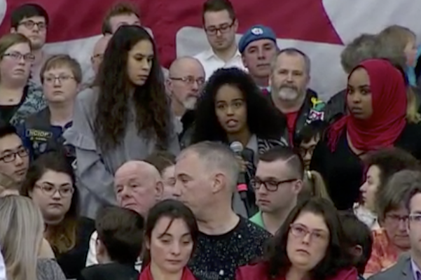 法蒂玛·阿利安(中)在市政厅会议上向贾斯廷·特鲁多询问她的弟弟阿卜杜勒·阿卜迪的情况。