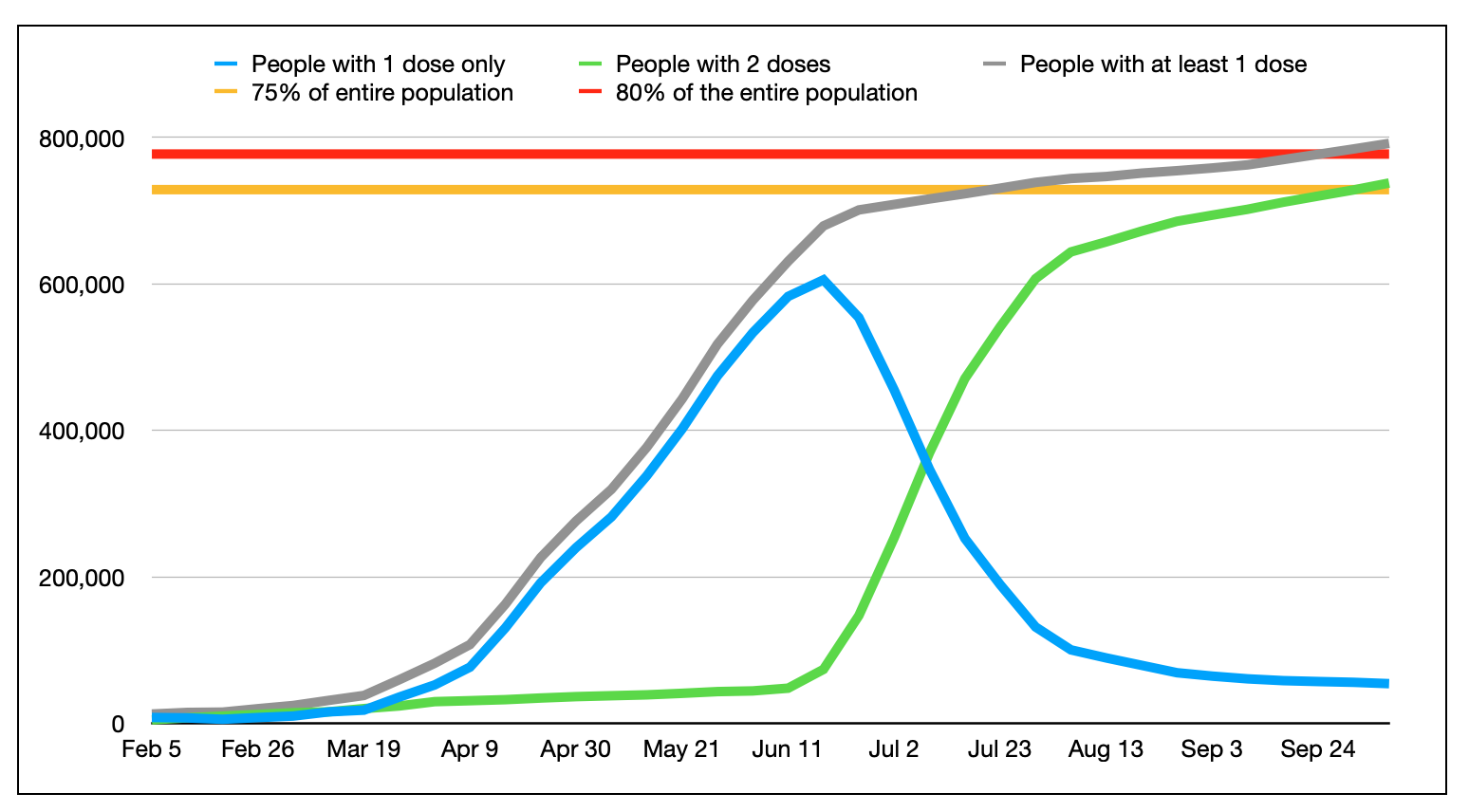 上图显示了大流行期间周五的疫苗接种进展情况。蓝线是只注射了一剂疫苗的人;绿线是两次注射的人;灰色的线是至少一剂;黄线代表75%的人口;红线是80%的人口。