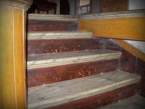 楼梯上的隔水管被漆成红色和黑色,让人联想到红木。金色的木制品被梳理成橡木的样子,楼梯的踏板是大理石的。令人愉快的!