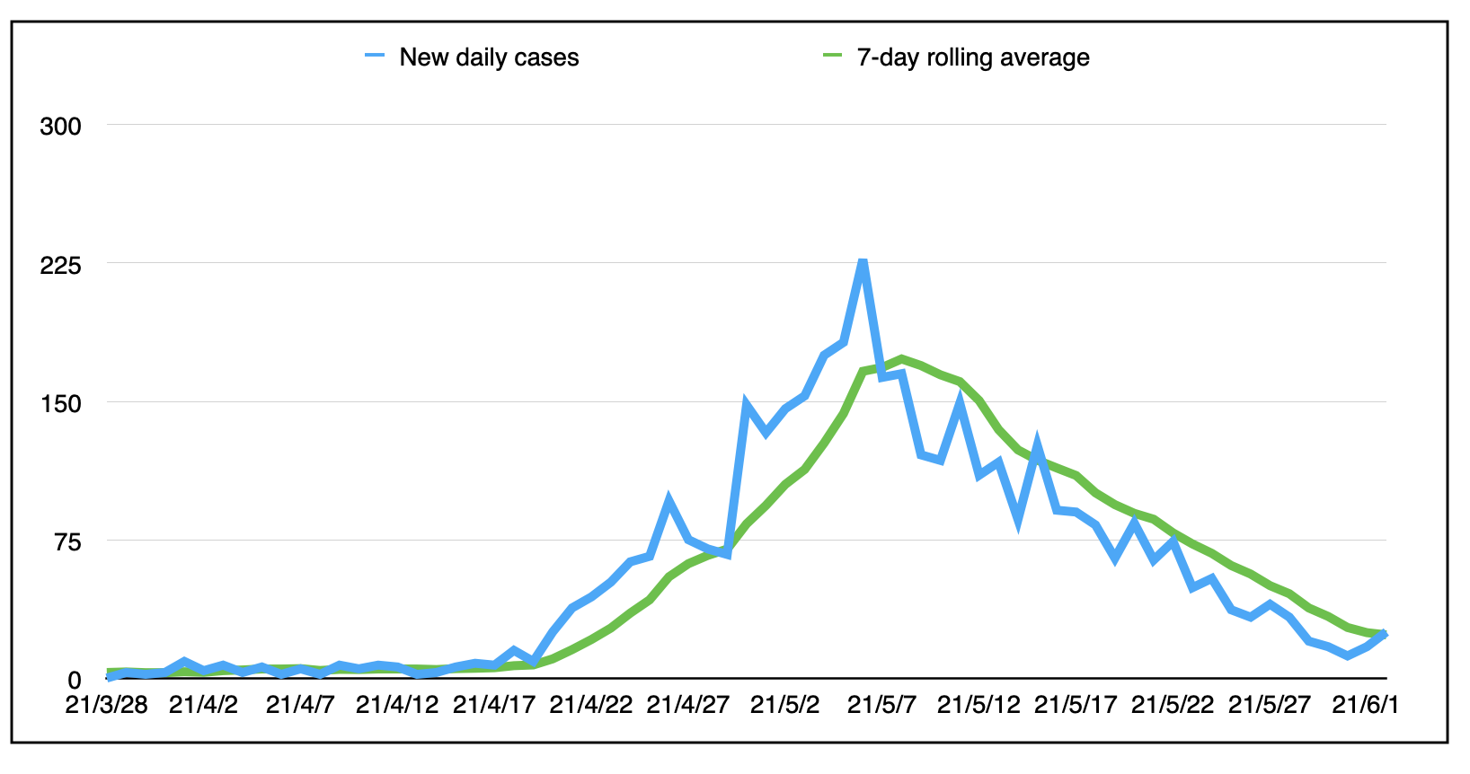 自3月18日(新斯科舍省零新增病例的最后一天)以来,新斯科舍省每天新增病例数和7天滚动平均数。
