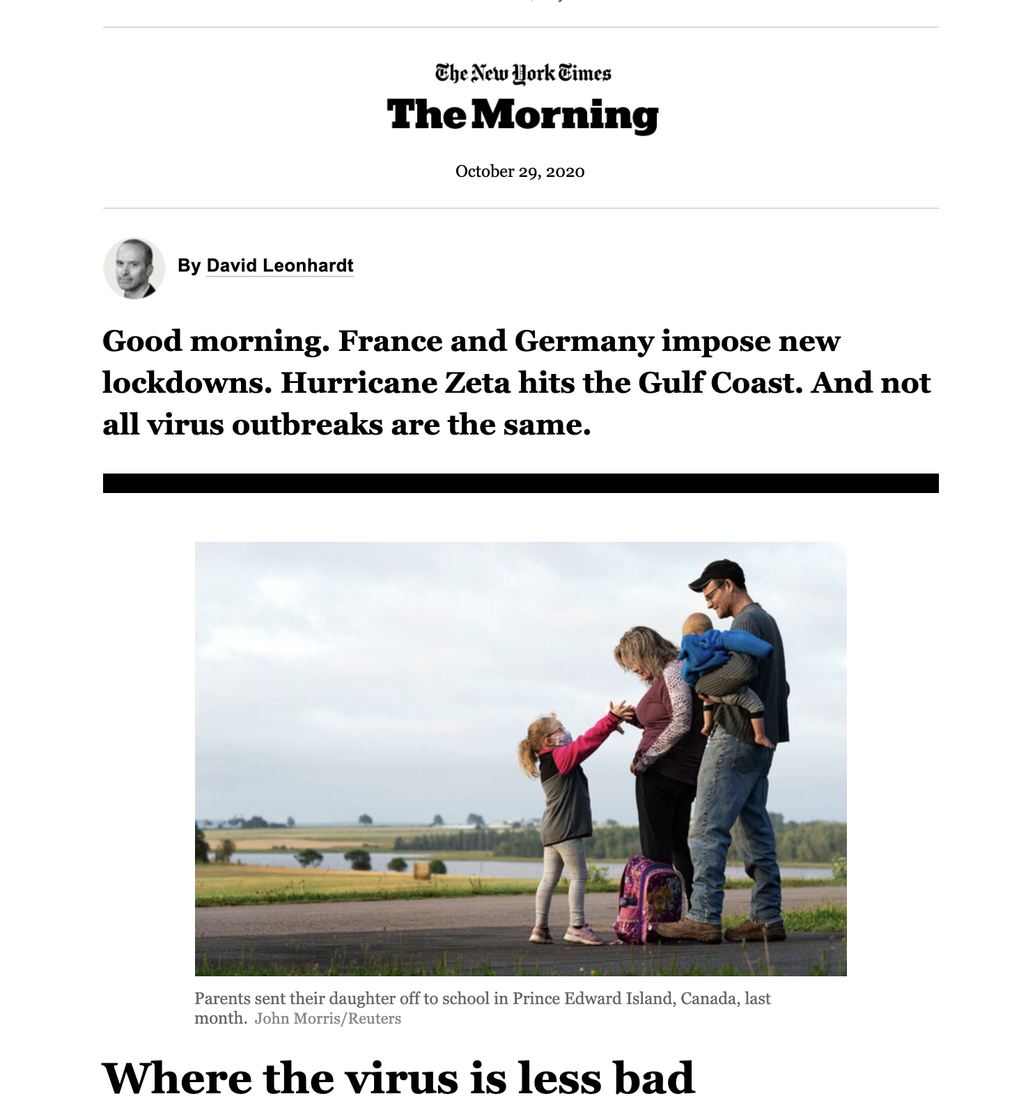 从编辑大卫莱昂哈德特,我常见的愉快“早上好”欢迎,紧随其后的最新全球新闻头条新闻:“法国和德国强加了新的锁定。飓风Zeta击中了海湾海岸。并非所有病毒爆发都是一样的。“