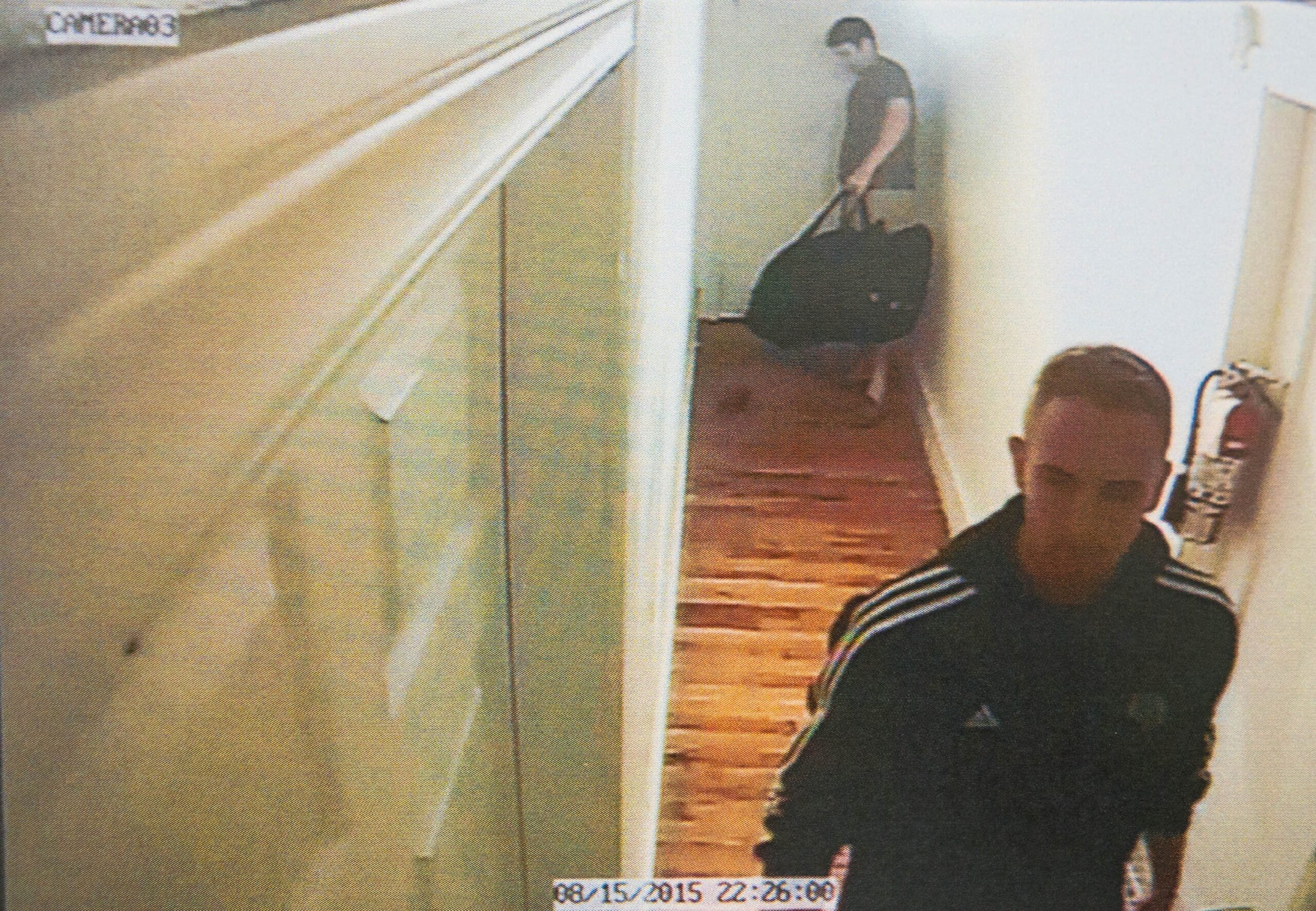 泰勒·萨姆森在哈利法克斯威廉·桑德森公寓外的走廊上,这是桑德森监控录像的截图。