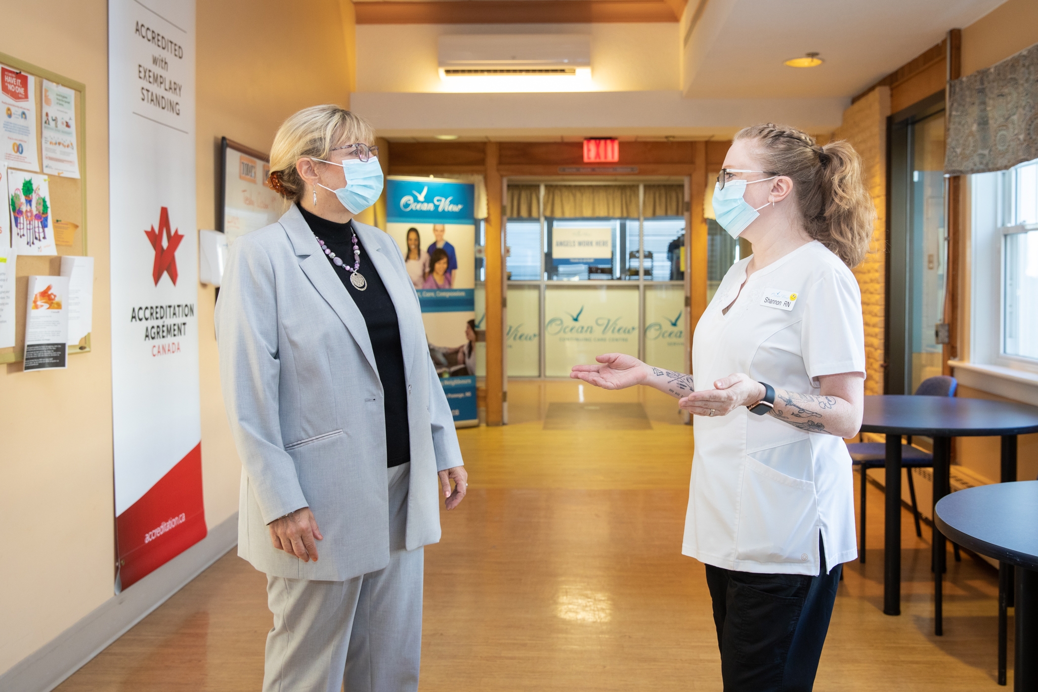 老年人和长期护理部长芭芭拉·亚当斯在海景持续护理机构会见了注册护士香农·莫里斯-哈顿。图片:通信新斯科舍省