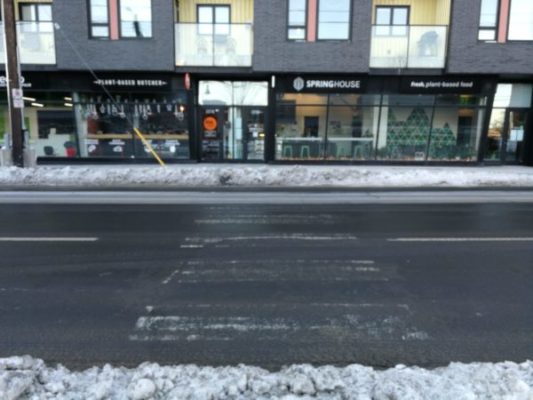 在他们的过渡街设计指南, NACTO建议,“应该在所有的交通站点提供安全的人行横道,包括街区中间的站点,除非到下一个路口的距离很短,通常是100英尺或以下。”对你我来说,那大约是30米,或者更少。图书馆的公交站在这个以前的人行横道旁边,从十字路口到任何方向都是80-90米。如果你在图书馆下车,过马路意味着步行或滚动总共约160-180米。