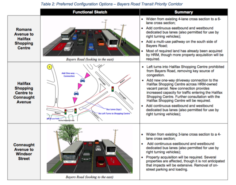 该市计划扩大道路,为两方向的专用公交车道提供方式,对私人车辆车道的影响最小。私人车辆司机将无法再左转进入拜耳路的哈利法克斯购物中心,而是需要使用单独建造的巷道,以便进入商场。Connaught Avenue和Windsor Street之间将丧失一个交通车道。该项目还包括一个多用途的路径,建在拜耳路的南侧,从罗马人到乔治Dauphinee,一部分的一部分,最终将看到与湖泊链路连锁的半岛和能力多用途路线。