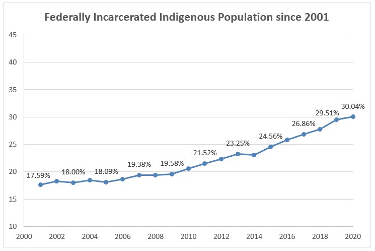 惩教调查员认为超过30%标志着一种深化伊妥“加拿大惩教制度。Zinger博士将这些趋势称为“令人不安和根深蒂固的不平衡”,注意到这些数字对土着妇女更令人不安,现在占加拿大囚犯人口的42%的妇女人口。惩教研究人员提请注意联邦更正似乎不受欢迎,对土着违规率高的需求,历史和社会现实的改变和反应迟钝。