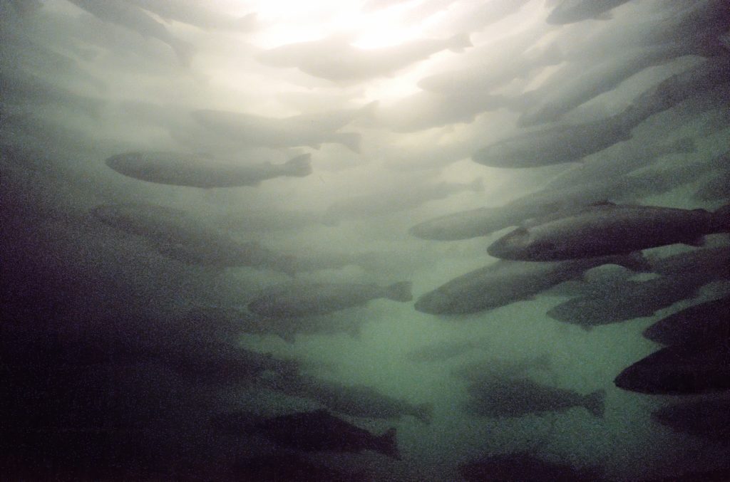 这是一张在水产养殖网箱中拍摄的水下照片,网箱中有高密度的鱼类。大西洋鲑鱼联合会(ASF)提供