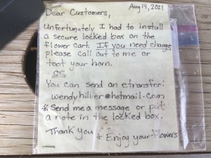加斯佩罗河谷花摊上的夹层信息。现金盗窃最近已经威胁到安纳波利斯谷路边摊的荣誉系统交易。照片:伊桑Lycan-Lang