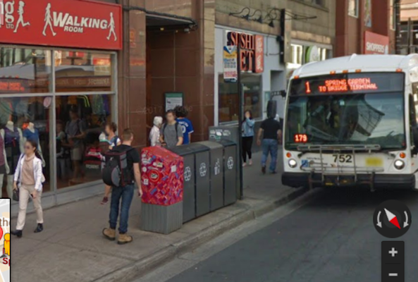 That is a particularly crowded stretch of sidewalk, but in my experience the sidewalk on the south side of street is even worse — that’s where people waiting for the bus congregate at the Sport Nova Scotia alcove and the sidewalk is narrowed by Canadian Post boxes and recycling and garbage bins.