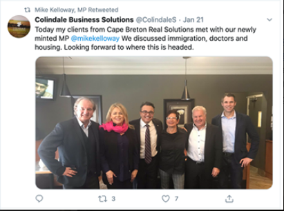 达米安·麦金尼斯的科林达尔商业解决方案公司1月发布的推特,展示了他与来自布雷顿角商业解决方案公司的客户(包括左边的安德烈亚斯·Popp和伊娃·赫尔曼,以及新上任的国会议员迈克·凯洛韦)的会面。