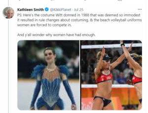 今年不是唯一一次在奥运会上对女性制服的哗然。我发现凯瑟琳·史密斯(Kathleen Smith)在Twitter上发表的精彩帖子关于“katerina规则”,它是在图纸katerina witt穿上由皮革和羽毛制成的服装,这些服装被标记为不足。