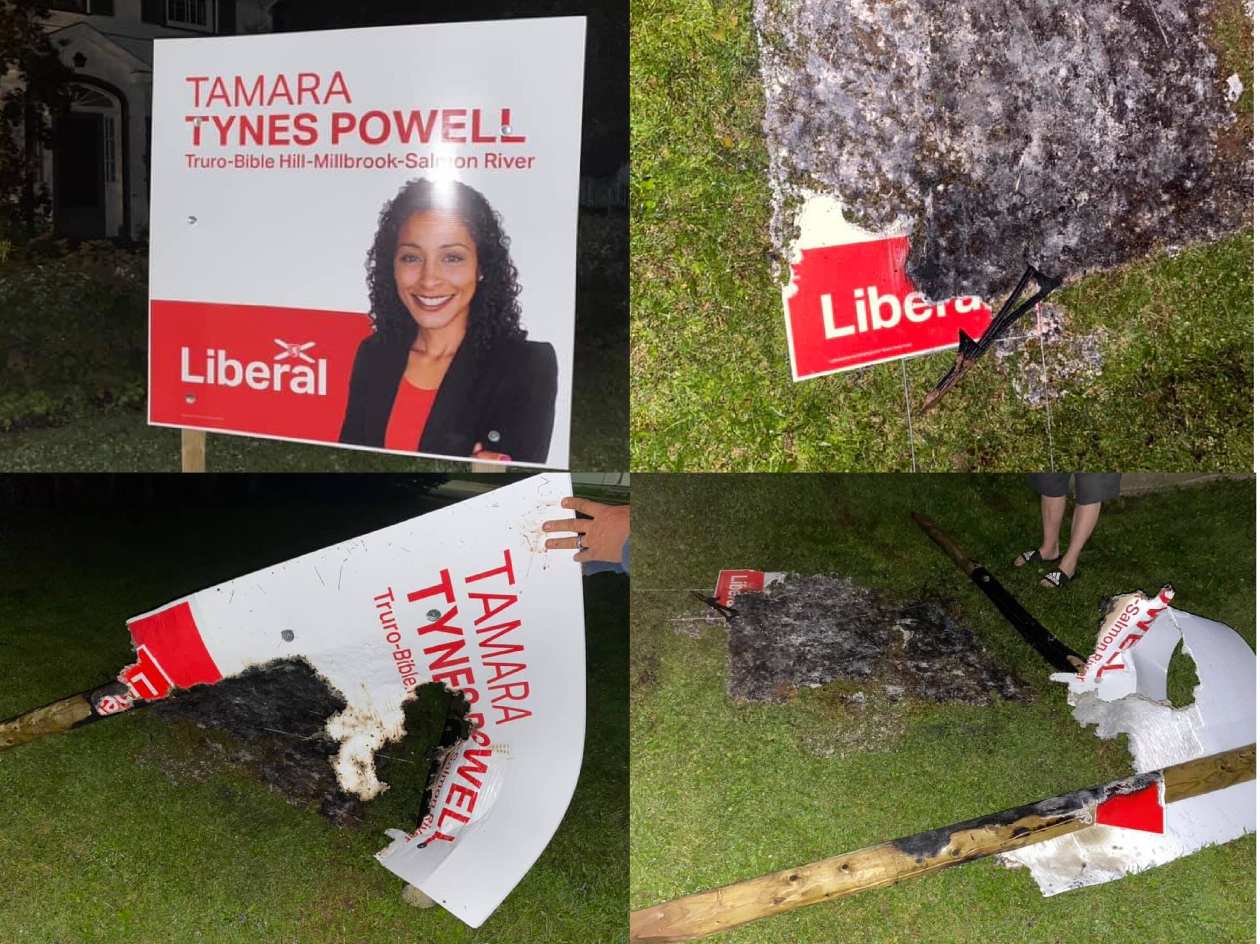 上周末,在特鲁罗-圣经山-米尔布鲁克-萨尔蒙河竞选的自由党候选人塔玛拉·泰恩斯·鲍威尔的竞选标语被损坏并烧毁。照片(s):丽诺尔Zann / Facebook