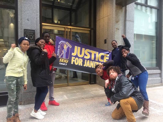 周五早上,清洁创始人广场的大理石师在建筑物外的新闻发布会和集会。正如Darius Mirshahi向媒体发布的新闻稿中所解释的,一个有司法4 Janitors的组织者: