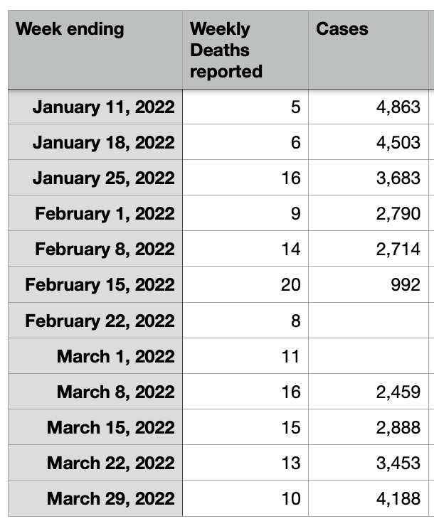 在截至3月29日的一周内,有10人死于COVID。此外,周二有51人因COVID而住院,他们仍有活跃病例,其中11人住在ICU。
