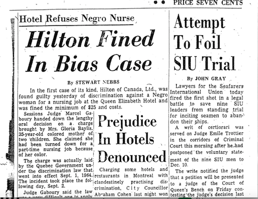 同年,在蒙特利尔,一位名叫格洛丽亚·贝利斯(Gloria Baylis)的妇女将伊丽莎白女王酒店告上法庭,这是加拿大历史上第一起指控基于种族的就业歧视的案件。