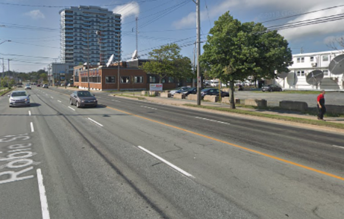 在Robie Street上提交的建筑渲染,不仅在拟议的建筑物前面显示街道树木,而且在CTV面前建造下一个街区。另请参阅:埋藏电线和新的街道灯具。