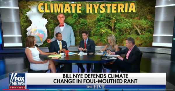 对于那些觉得奈的言论有点令人耳目一新的人(“你们现在是成年人了,这是一场真正的危机!”),有必要注意的是,在福克斯新闻(Fox News),这番言论被诬陷为完全不同的东西。这是The Five的屏幕截图,成千上万的观众正在讨论“气候歇斯底里症”,以及他们认为民主党人关注气候变化的“心理问题”。