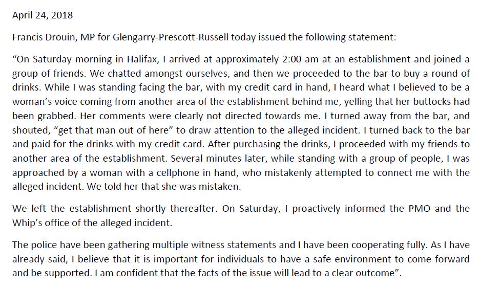 第二天,我们从几则新闻报道中得知,所谓的性骚扰者是自由党议员弗朗西斯·德劳因。