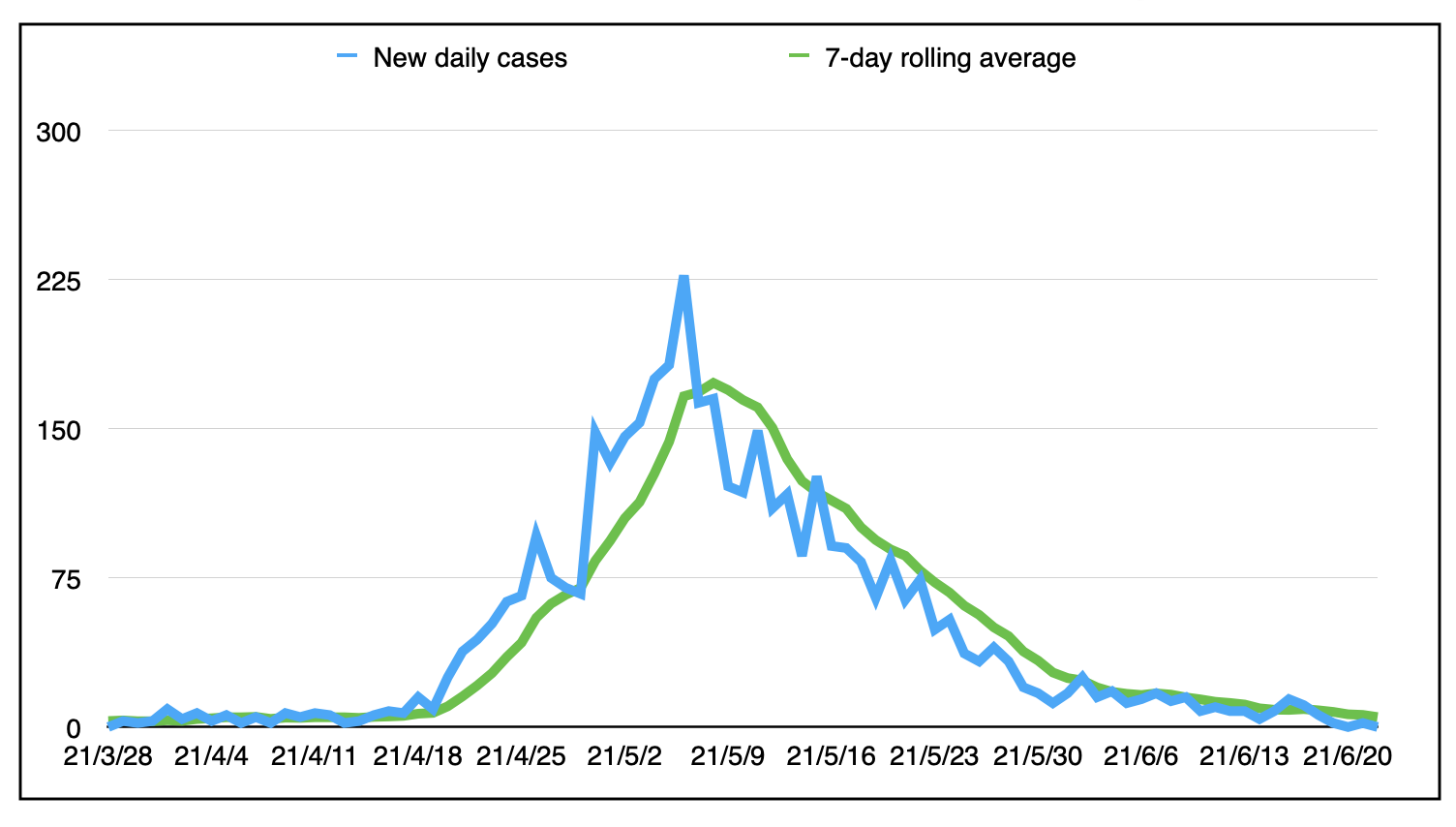 以下是日常新案例编号和七天的滚动平均值(今天的5.0)以来,自3月28日起: