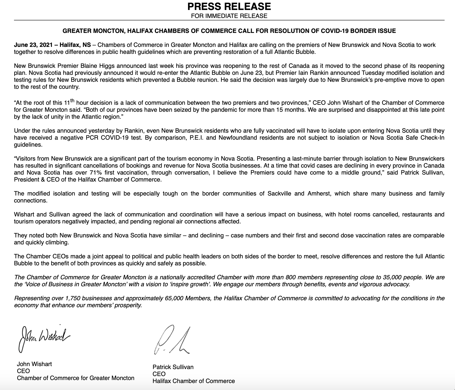 毕竟,发布了哈利法克斯和蒙克顿的商会一份声明谴责边境限制,因为他们“将对业务产生严重影响,酒店客房取消,餐馆和旅游运营商受到负面影响,并待处理区域空中联系。”房间没有提到封锁将对业务的影响。