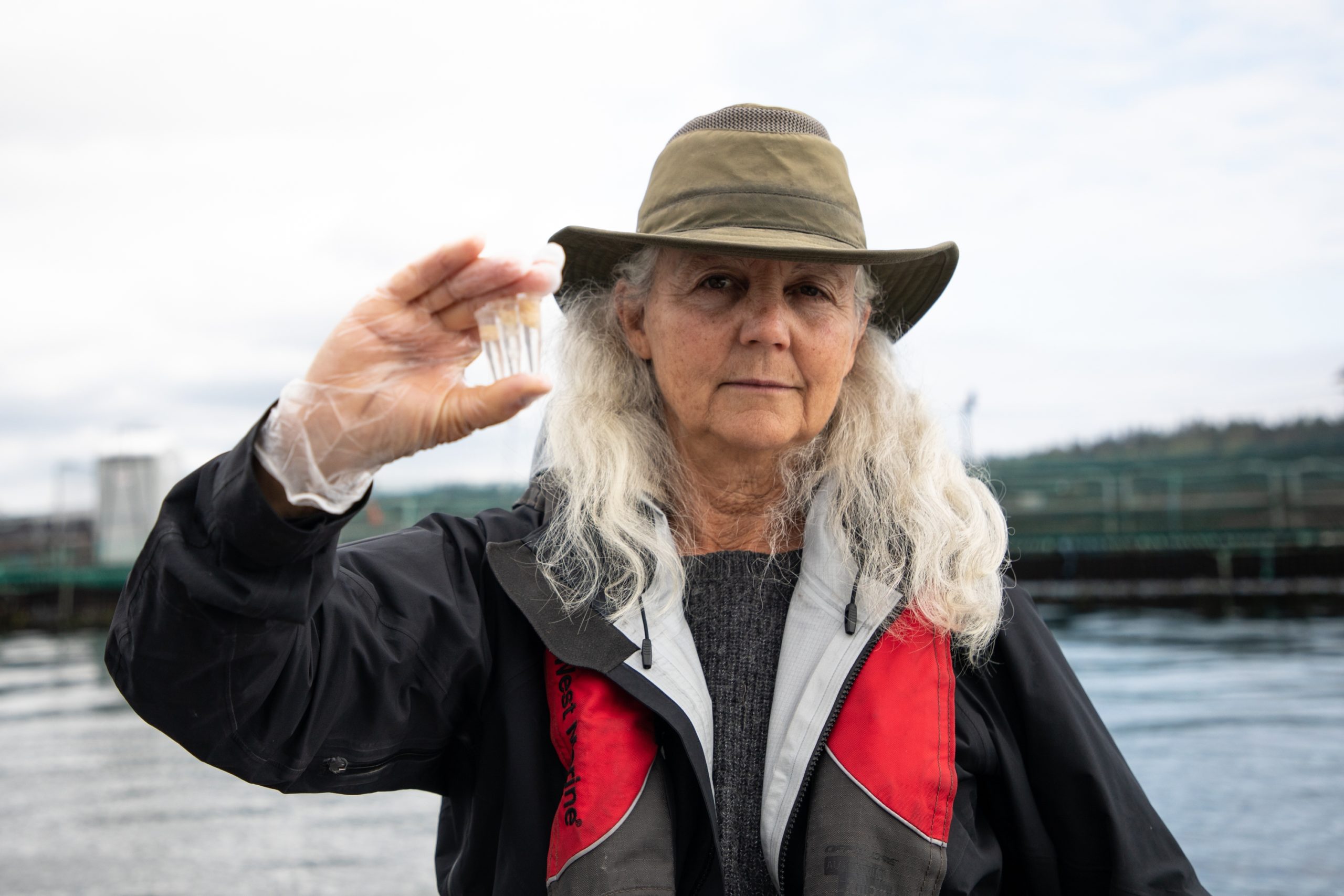 亚历山德拉·莫顿(Alexandra Morton)拿着小瓶,里面装着从鲑鱼养殖场外收集来的鲑鱼粪便样本,这些样本将用于检测PRV。她说,大多数农场都被感染了。照片了