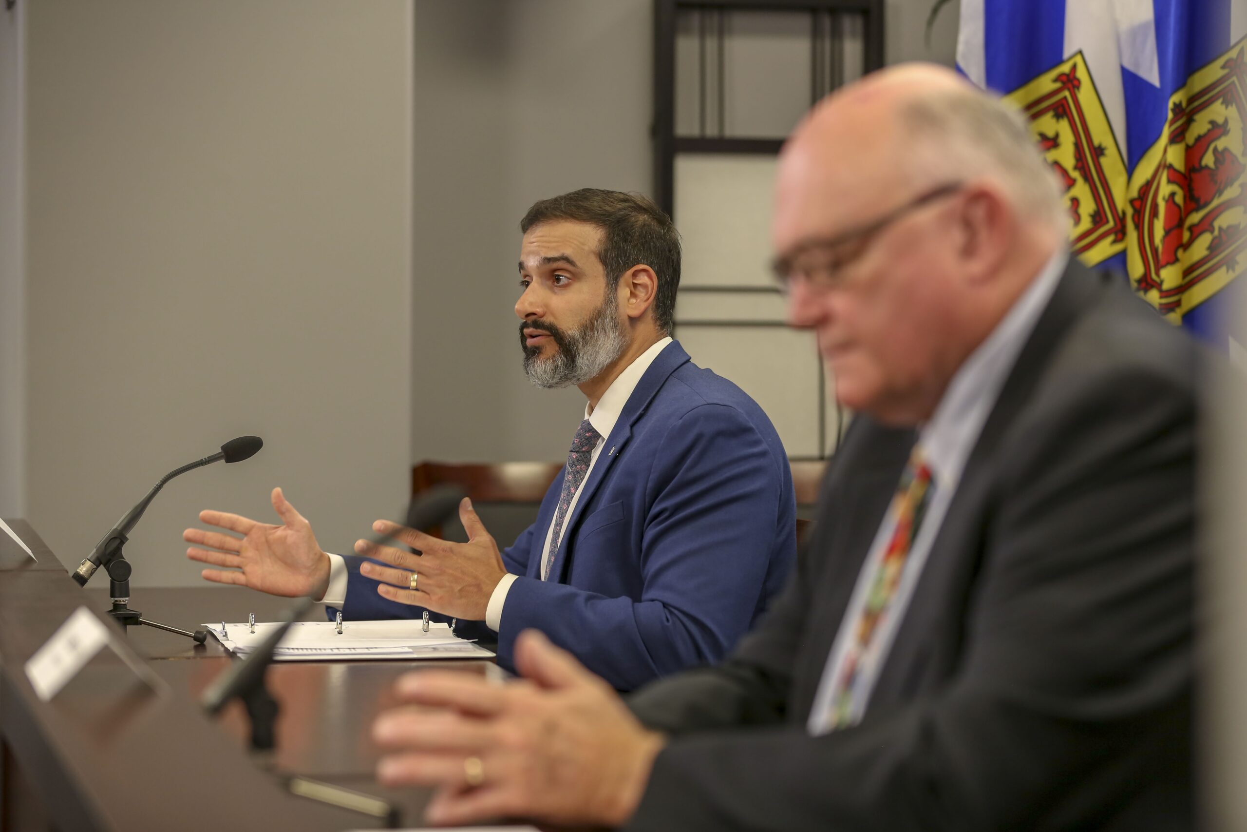 教育部长扎克·丘吉尔(左)和罗伯特·斯特朗博士宣布重返校园计划。图片:通信新斯科舍省