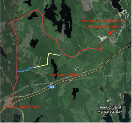 红线表示10.5公里道路已经存在连接5A到斯科伊材料的邮政道公路采石场和沥青厂。返回2014年,本公司向DNR土地服务提出了正式要求,以便将其作为“运输路线”从采石场到(未来)交汇处。黄线显示了4月/ 2019年5月清除的1.5公里。这条新道路连接到翻新和再分级道路(蓝色)时,该部分(黄色+蓝色)的总长度大约3公里长,使出口5A和Tote Rd之间的距离。在新的“Ingram Access Road”,距离已经超过7公里,或比现有路线短4公里。沿着高速公路103跑的米色彩色线是2013/2014年为Ingramport交换和连接器项目切割的“平行道路”。根据TIR,当时清除60米宽的条款,并用于现场调查,但最终被遗弃为道路选择。