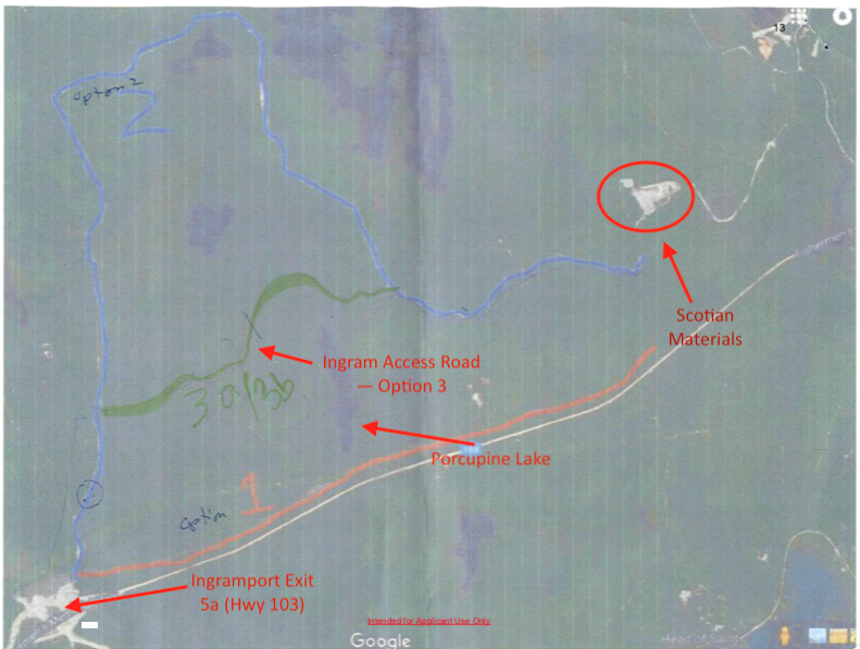 2014年9月:斯科舍材料做出正式请求DNR土地服务方式的权利(ROW)在官地“以方便从采石场运输路线在Ingramport交换(未来)。”地图指示通路的新联通是已经存在的,长的林间小路。
