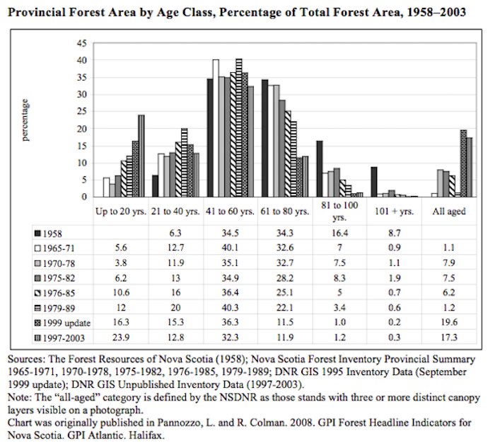 我要求评论的原因是我真的很沮丧。自20世纪50年代以来,DNR在定期的“森林清查”报告中报告了该省和地区的年龄等级和物种组成,大量的数据被解读为供公众消费的信息。过去45年的历史趋势表明,该省的森林变得越来越年轻,古老的森林正在消失,物种组成也在改变——改变了过去的样子从阿卡迪亚森林进入北方.我想用最新的数据更新年龄阶层的历史趋势线(见下图),但根据邓恩的说法,访问它的唯一方法是签署数据共享协议。