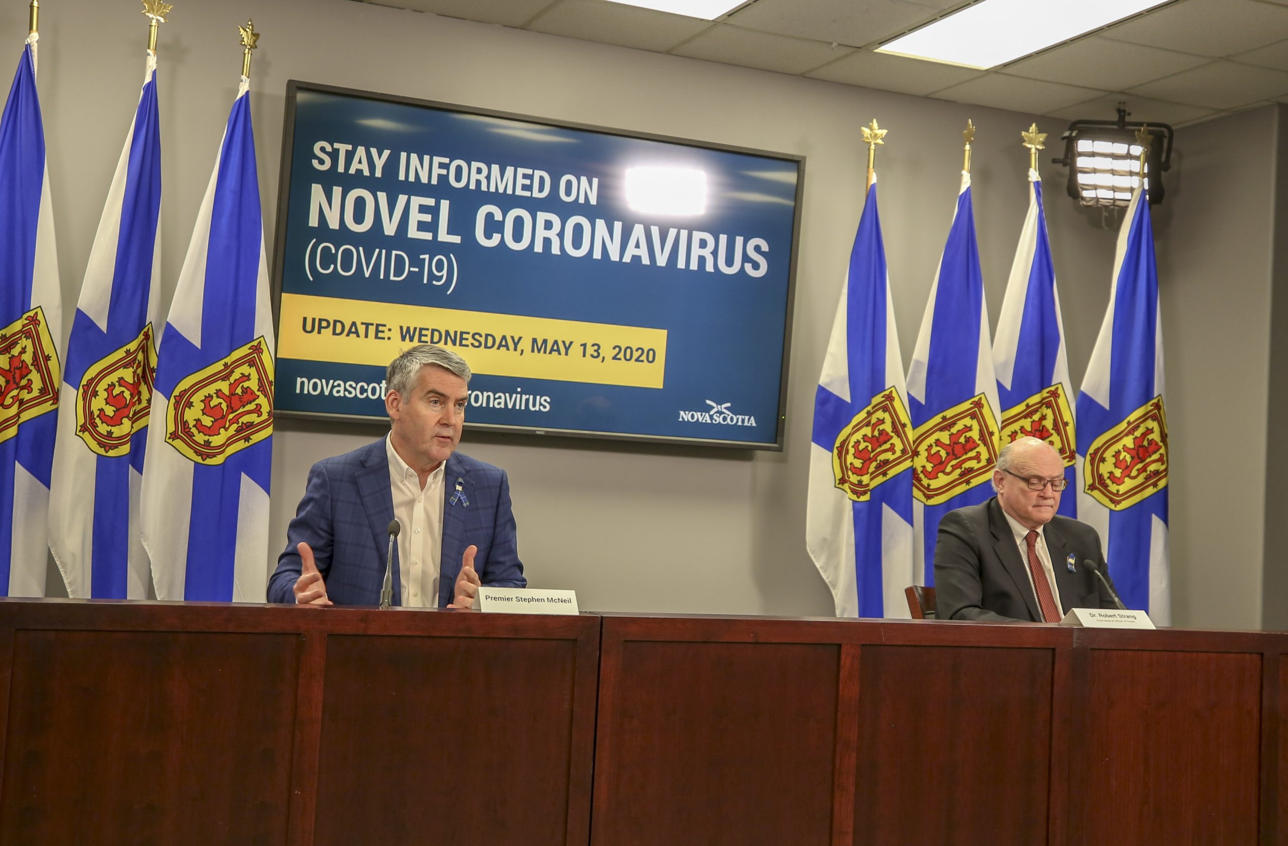 斯蒂芬麦克尼尔(L)首席斯蒂芬·麦克尔(L)和卫生博士博士罗伯特博士的首席医学官在Covid-19发布会上,星期三,5月13日,2020年5月13日。照片:通讯Nova Scotia