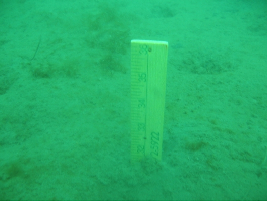 标尺直立在废物层,高达32英寸的标志,茅顿港湾。凯西和戴夫·布拉什
