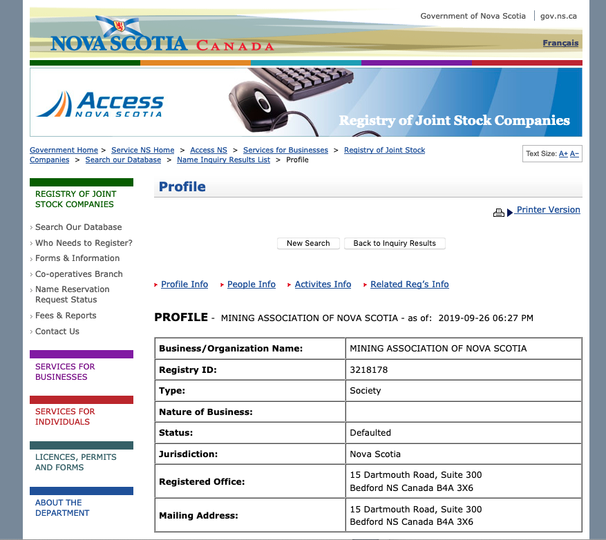 思考可能是联合股票上市的登记处已经过时,或者新斯科舍省的矿业协会现在可以在不同的名称下登记,我联系了Nova Scotia和内部服务部门,负责联合股票。