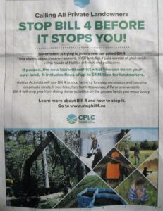 哈利法克斯活动家将使用比尔4停止在私人土地上养殖,林业,娱乐和住房。如果您徒步旅行,钓鱼,狩猎,雪鞋,ATV或SnowMobile Bill 4将阻止您在今天享受的私人土地上进行这些活动。