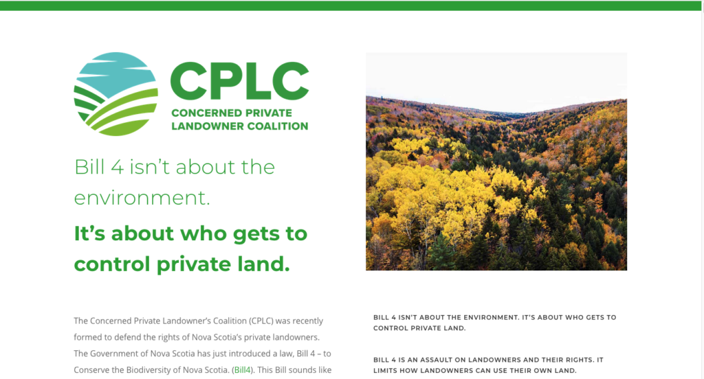 不到一个星期后生物多样性行为被介绍,所谓的“有关私人土地所有者联盟” - 主教说的是“不是正式的组织” - 建立了一个网站,一个Facebook页面, Twitter的句柄(@CPLC_NS),甚至还有自己的logo和首字母缩写CPLC。