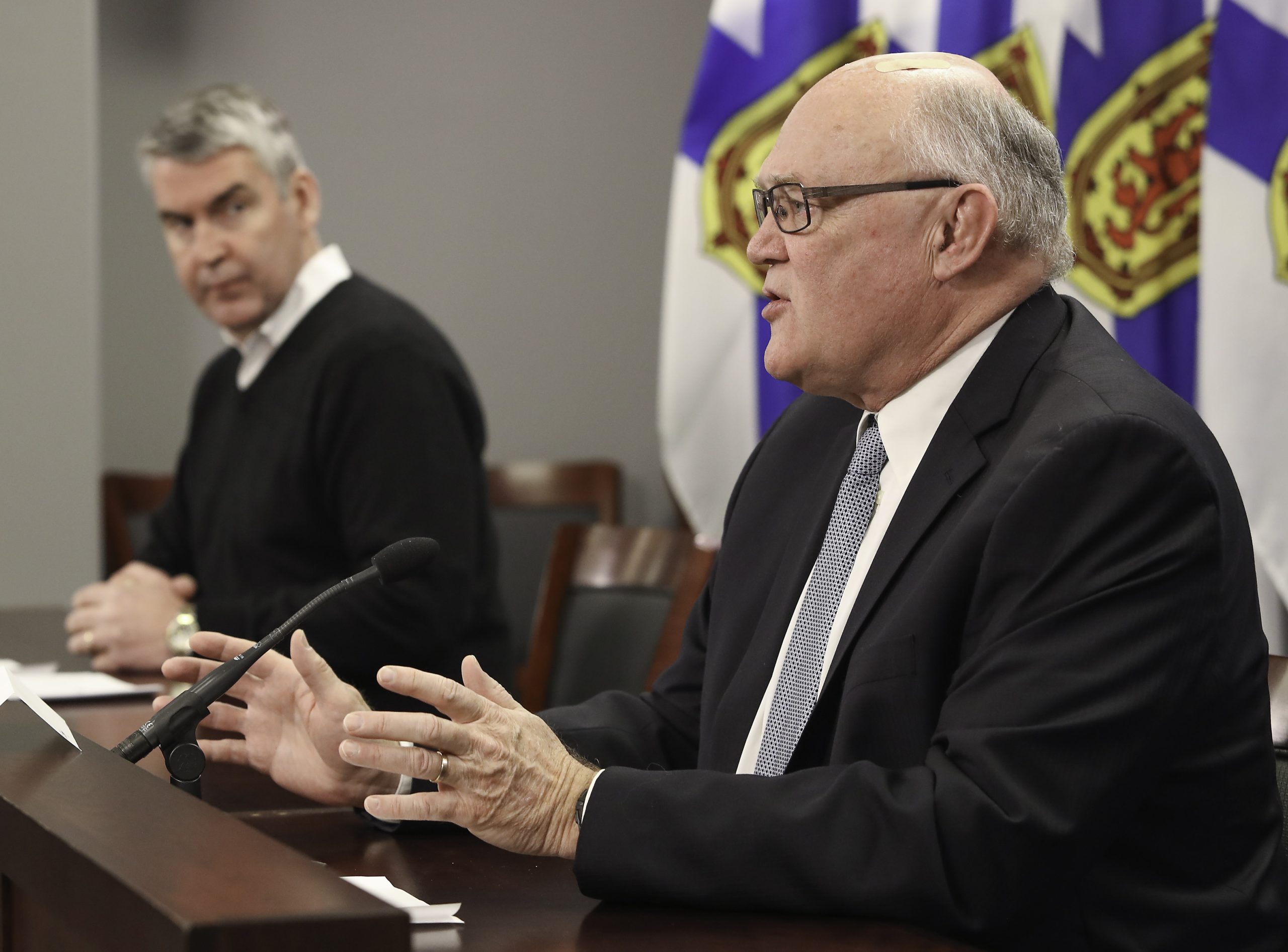 2020年4月19日,国务院总理斯蒂芬·麦克尼尔(左)和罗伯特·斯特朗博士在新冠肺炎疫情每日简报会上。图片来源:新斯科舍省通讯公司。