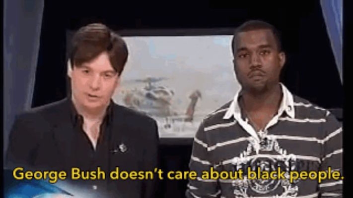 2005年9月2日,卡特里娜飓风过后新奥尔良的景象震惊了全世界,坎耶·韦斯特登上舞台在飓风救援音乐会。站在迈克·迈尔斯身边,韦斯特脱稿了。他的著名言论“乔治·布什不关心黑人”表达了黑人对布什政府放任黑人死去五天的毫无顾忌的愤怒。